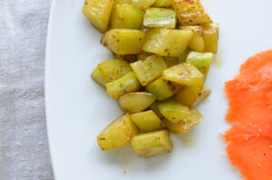 Have you ever thought of cooking cucumbers in a pan? Cucumbers become sweet and tender this way, a perfect side dish for a tasty second course, in my case some smoked trout carpaccio.