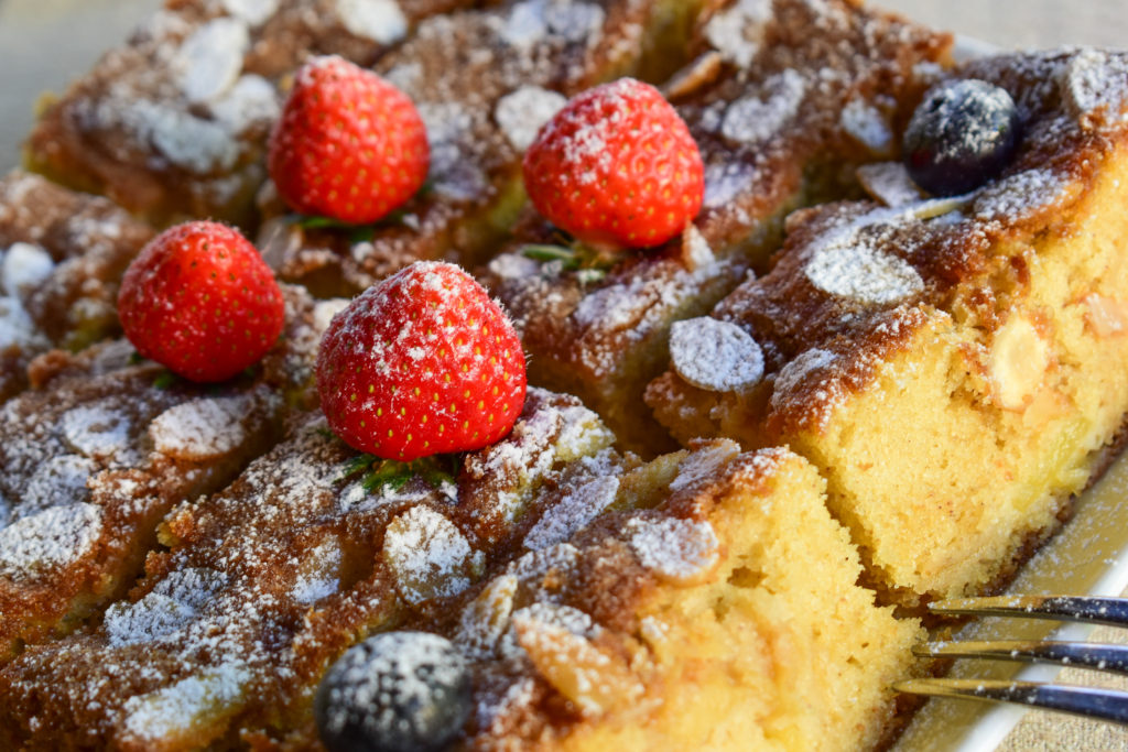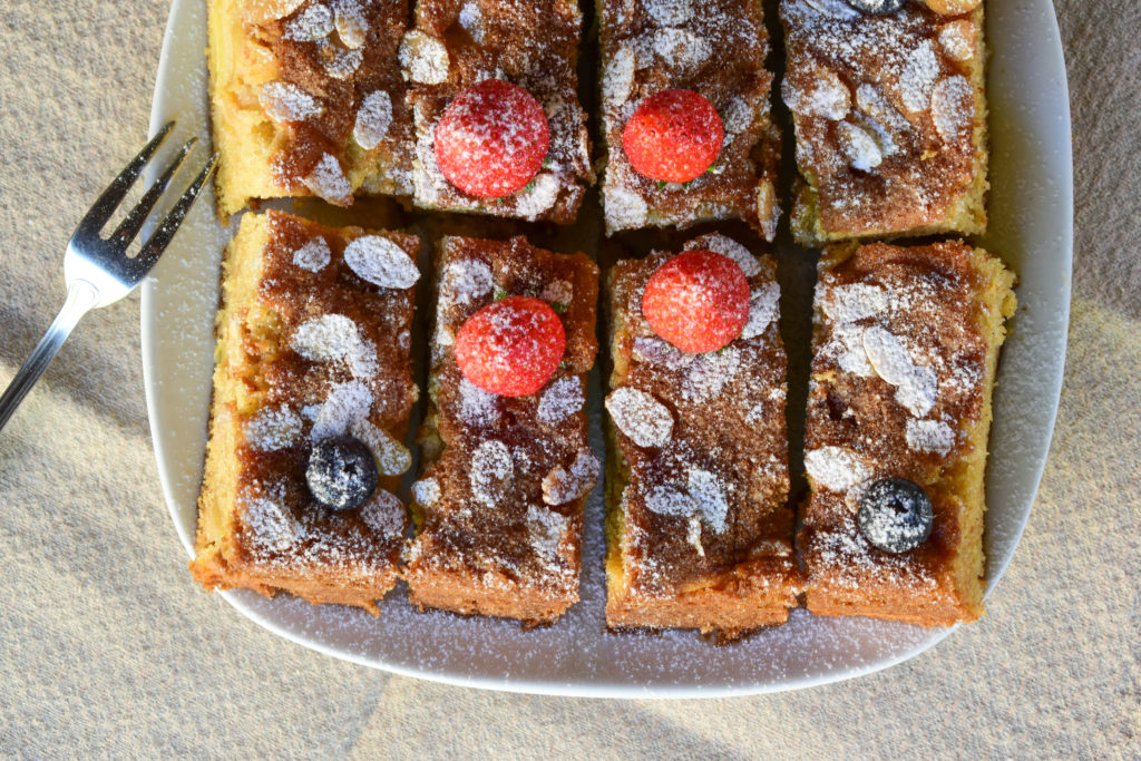 I mixed together icing sugar and cinnamon and sprinkled on the surface. I sprinkled with the almond fleaks as well.