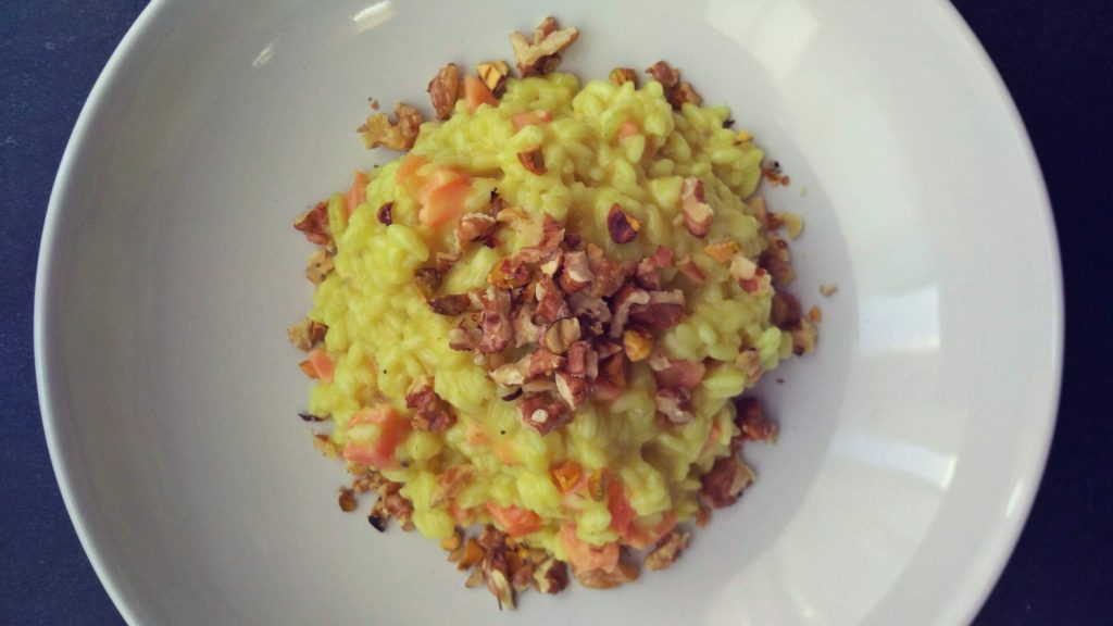 Coconut milk risotto with salmon, walnuts and pistachio